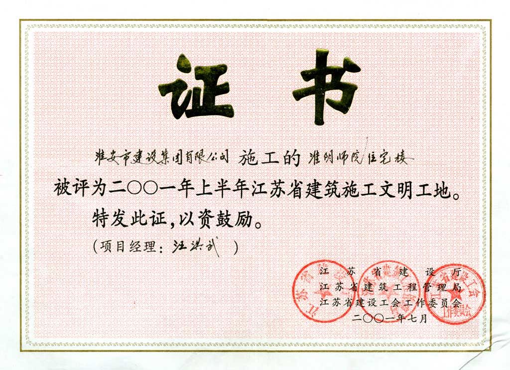 2001年度省建筑施工文明工地淮阴师院住宅楼-汪洪武