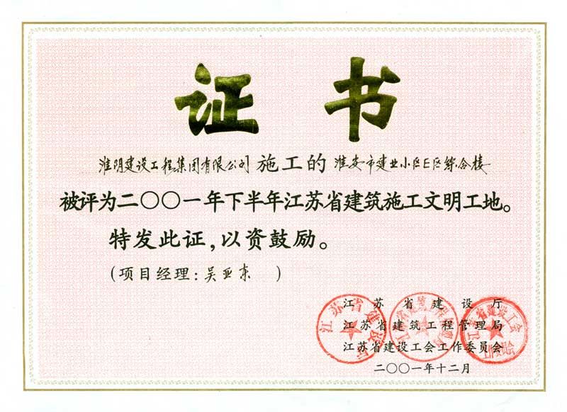 2001年度省建筑施工文明工地淮安市建业小区综合楼-吴亚东
