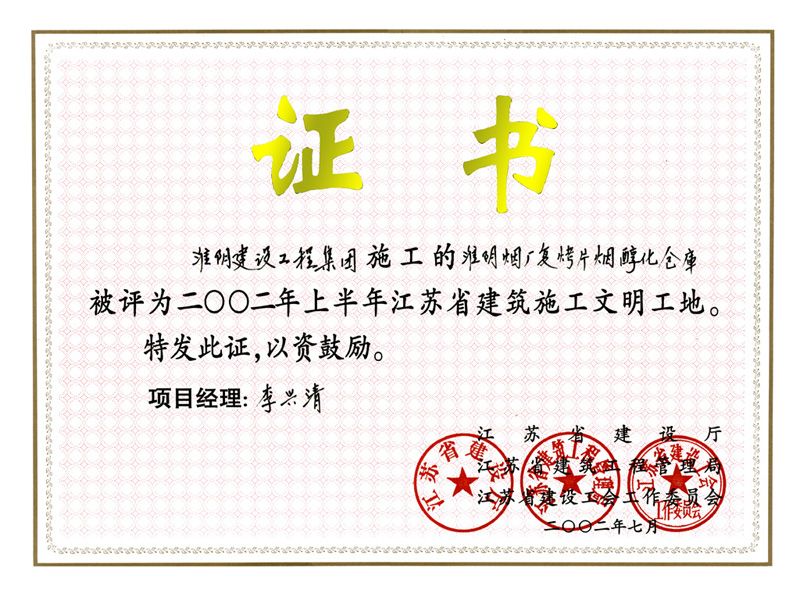 2002年度省建筑施工文明工地淮阴烟厂复烤片烟醇化仓库-李