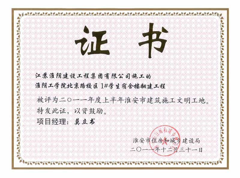 2011年文明工地淮阴工学院北京路小区1#学生宿舍楼接翻建