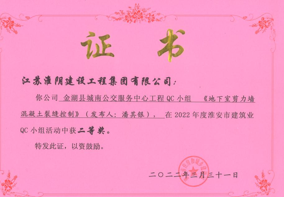 淮安市建筑业QC小组二等奖
