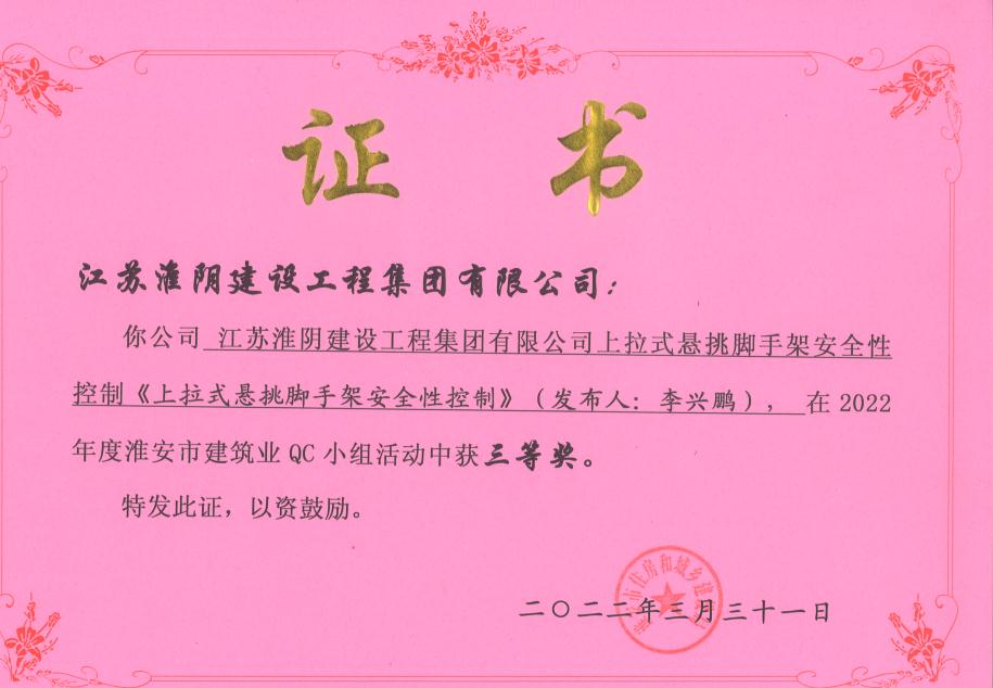 淮安市建筑业QC小组三等奖