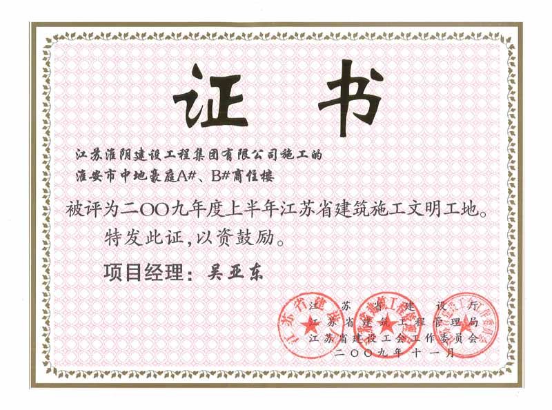 2009年省文明工地淮安市中地华庭A#、B#商住楼-吴亚东